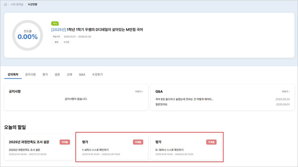 🧭 과정 내 평가 확인 방법평가 참여하기 : 나의 강의실 → 강의실 입장 → 오늘의 할일 → 평가 → 응시하기 버튼 클릭